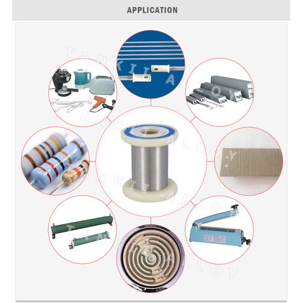 Typical applications for Ni80Cr20 are electric heating elements in home appliances,industrial furnaces and resistors(wirewound resistors,metal film resistors), flat irons, ironing machines, water heaters, plastic moulding dies, soldering irons, metal sheathed tubular elements and cartridge elements.